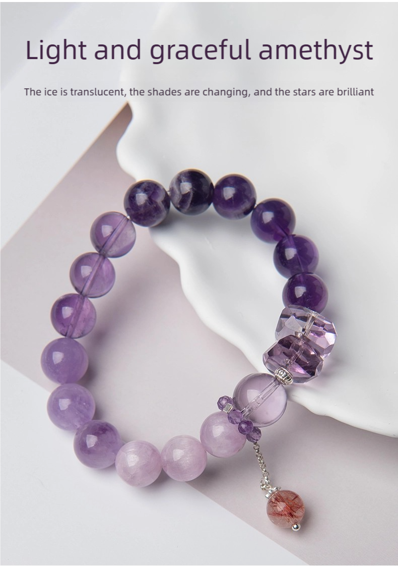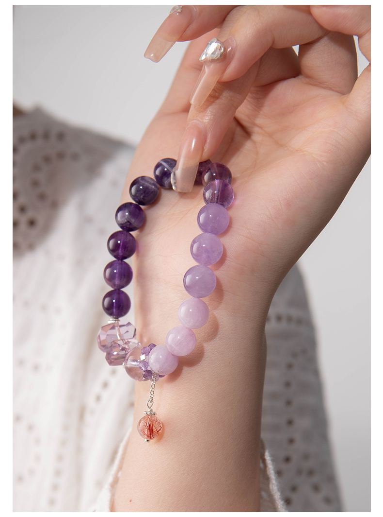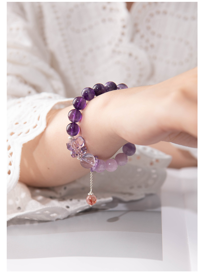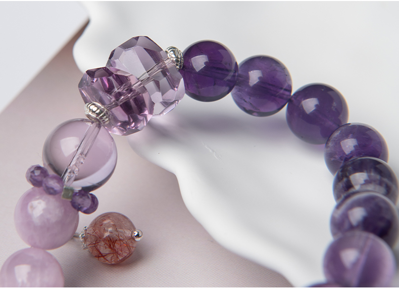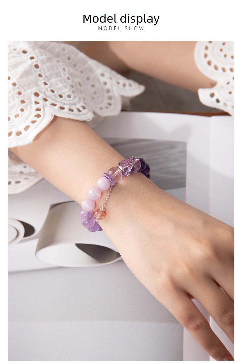 This amethyst bracelet is not only a beautiful accessory but also contains profound implications. It is like a token bestowed by the god of love, guarding the loyalty and romance of love and helping singles encounter good fortune. It is also like a crystallization of wisdom, which can enhance thinking ability and help you stand out in academics and the workplace. At the same time, it is also the guardian of the soul. With mysterious purple light, it soothes anxiety, dispels negative energy, brings you peace and a sense of security, and allows good luck, love, and wisdom to always be by your side.