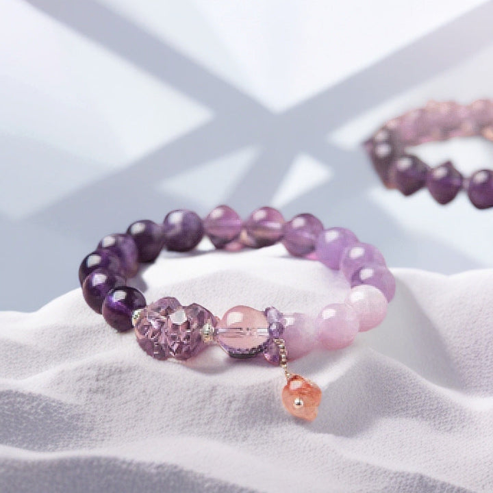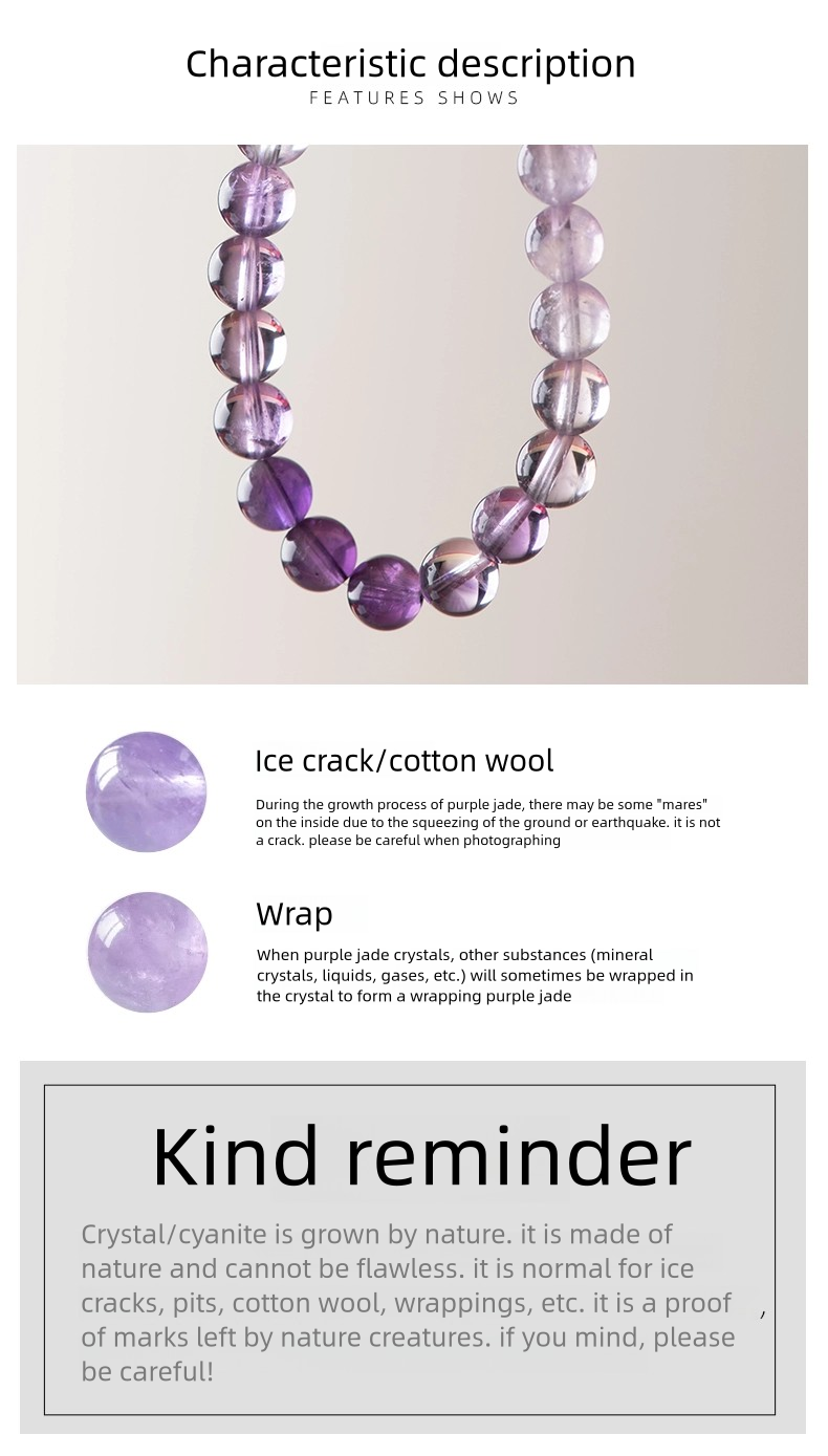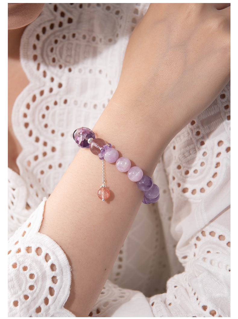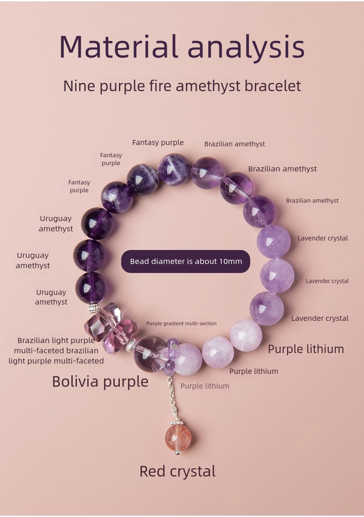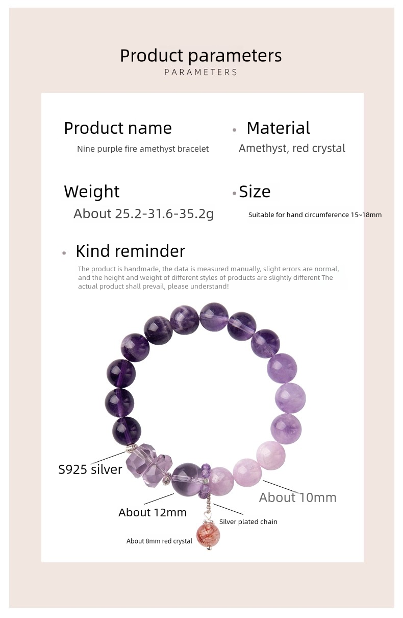 This amethyst bracelet is not only a beautiful accessory but also contains profound implications. It is like a token bestowed by the god of love, guarding the loyalty and romance of love and helping singles encounter good fortune. It is also like a crystallization of wisdom, which can enhance thinking ability and help you stand out in academics and the workplace. At the same time, it is also the guardian of the soul. With mysterious purple light, it soothes anxiety, dispels negative energy, brings you peace and a sense of security, and allows good luck, love, and wisdom to always be by your side.