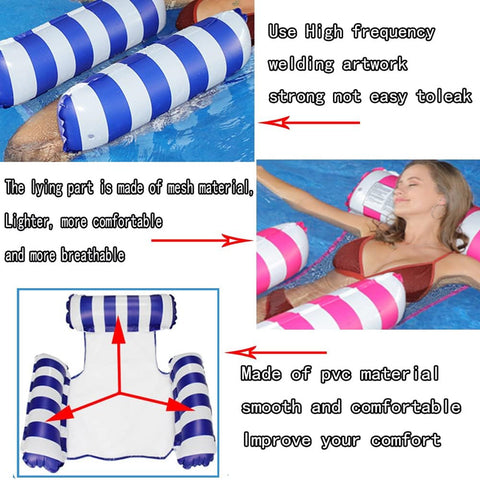 Multifunktional einsetzbar – Das Design dieser Schwimmhilfe lässt sich in eine Hängematte, einen Stuhl, eine Schwimmhilfe oder einen Trainingssattel verwandeln. Sie können Ihre Haltung auf der Wasserhängematte frei verändern und im Schwimmbad für Unterhaltung und Entspannung sorgen. Auch wenn Sie nicht gut schwimmen können, können Sie das Wasserspiel genießen.