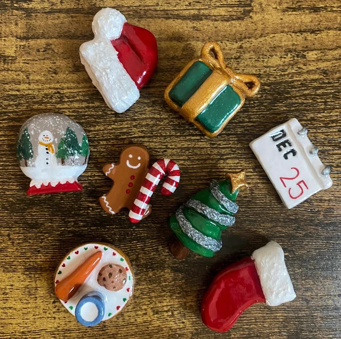 Magnetic Decorations:“DEC 25” calendar tile,Santa hat , snow globe,Christmas tree , gingerbread man,Gift box , red stocking,Cookie and carrot plate