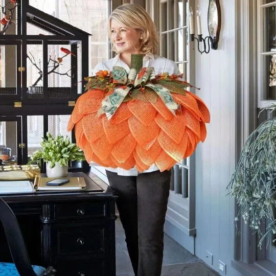 The body of the pumpkin is constructed with poly burlap mesh in orange. The pumpkin stem is olive green poly burlap mesh. Berry accents and a lovely bow adorned with pumpkins complete the look.Ā