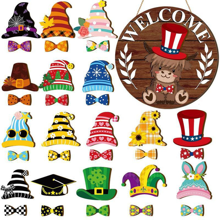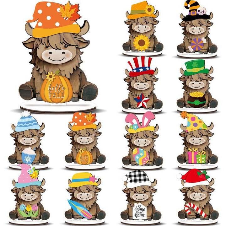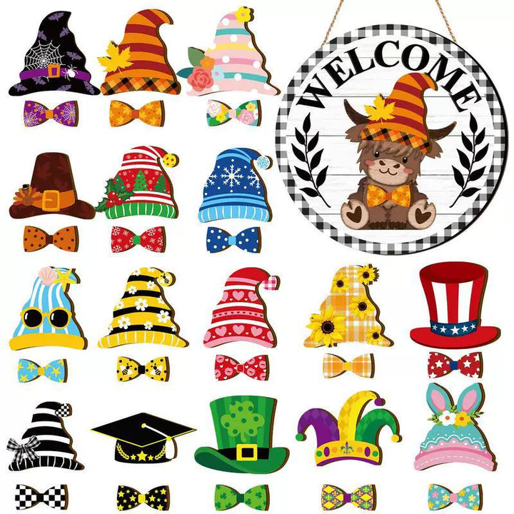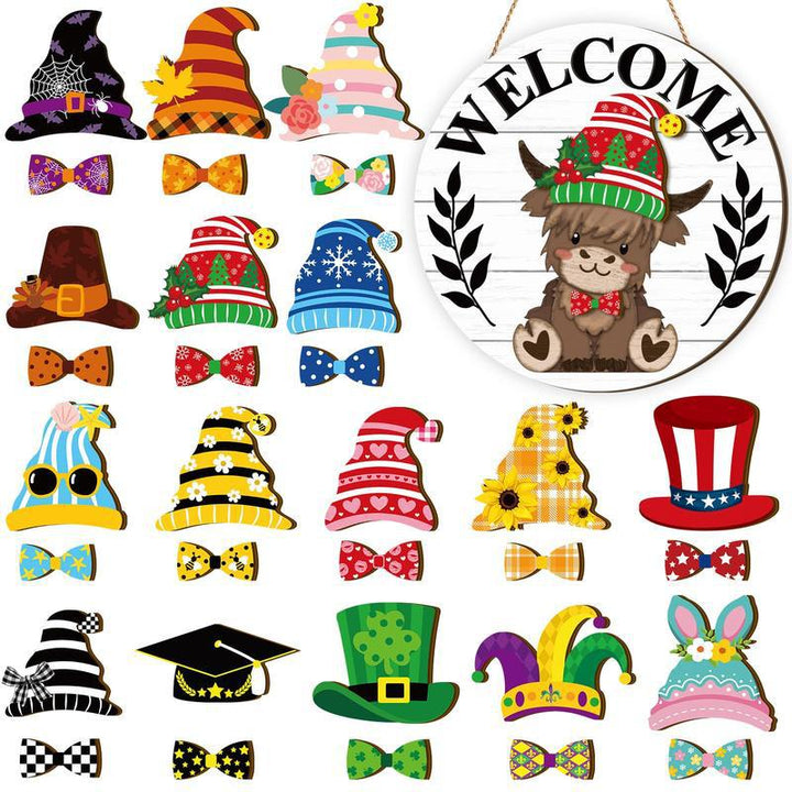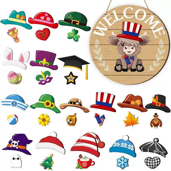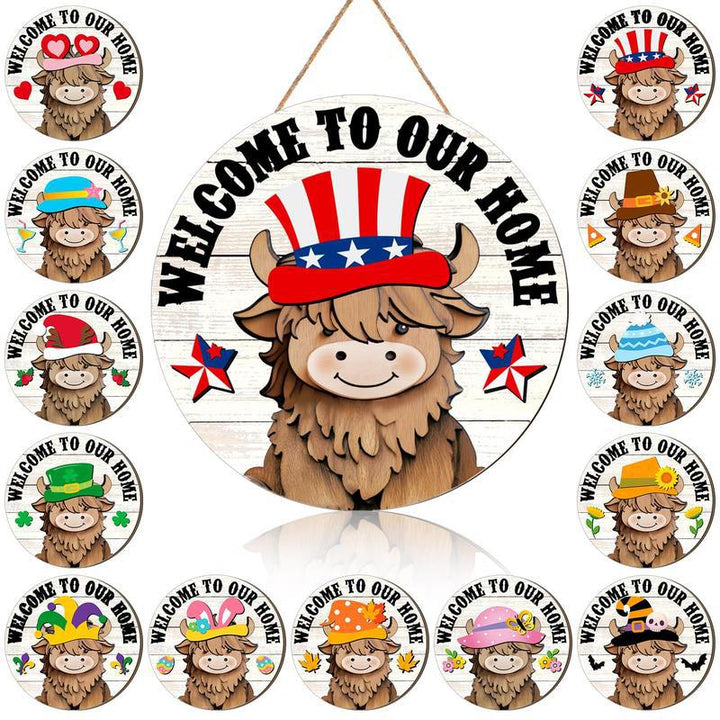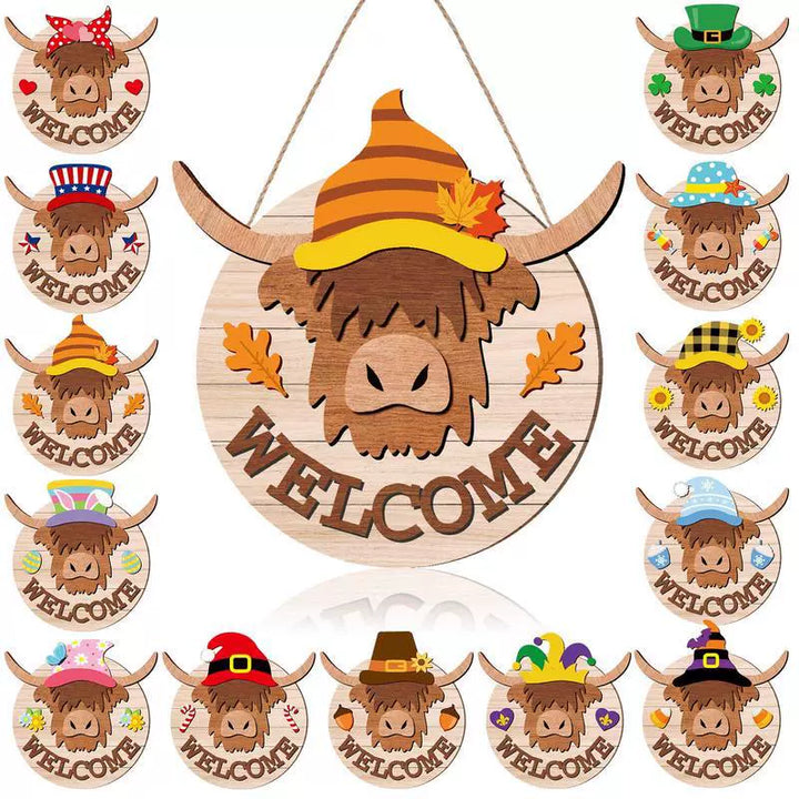 ⏰Interchangeable Welcome Sign with Highland Cow Featuring Seasonal Magnet, Detachable Hats, Accessories